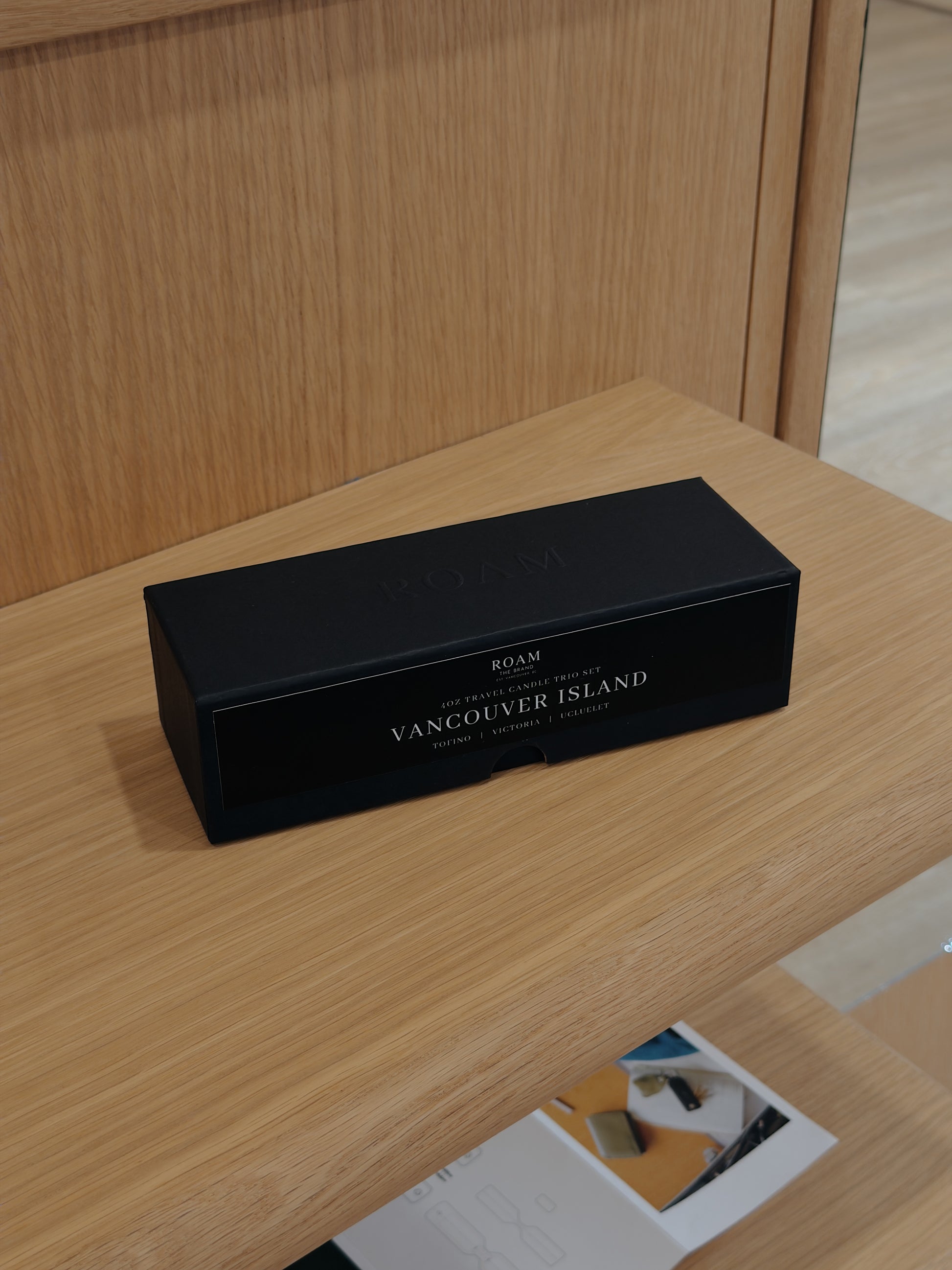 A curated set of 3 travel candles from our Vancouver Island collection, housed in a sleek black gift box.