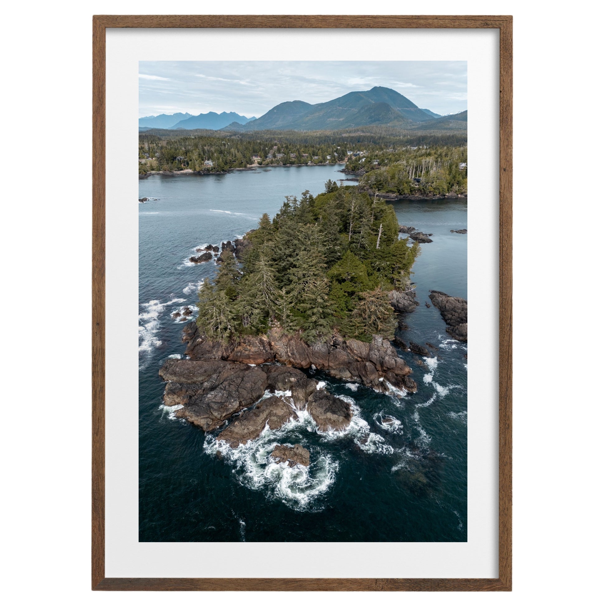 A serene moment of coastal wilderness, with the raw beauty and depth of Vancouver Island’s wild Pacific coastline. The lush PNW alpine fringes the rocky, dramatic shoreline, with the coastal mountains rising behind. Location: Ucluelet, Vancouver Island, Canada